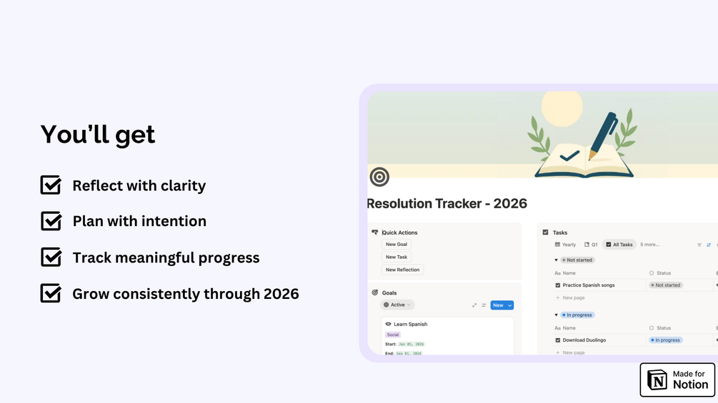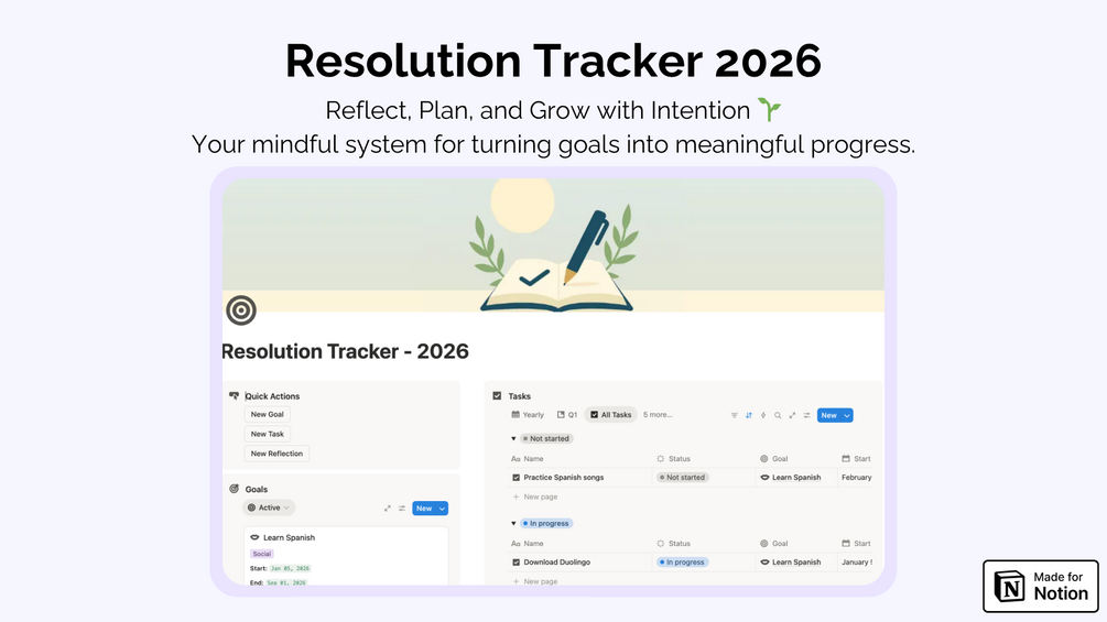The Resolution Tracker 2026 Notion template is your all-in-one system for reflection, intentional goal-setting, and consistent progress tracking.